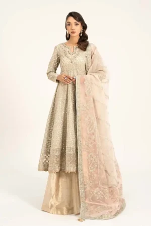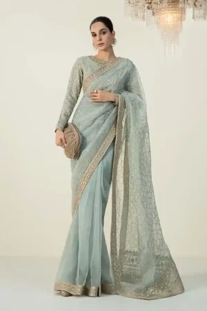 The collection showcases luxurious fabrics like chiffon, organza, silk, and net. These materials provide a graceful drape and a rich, elegant look.