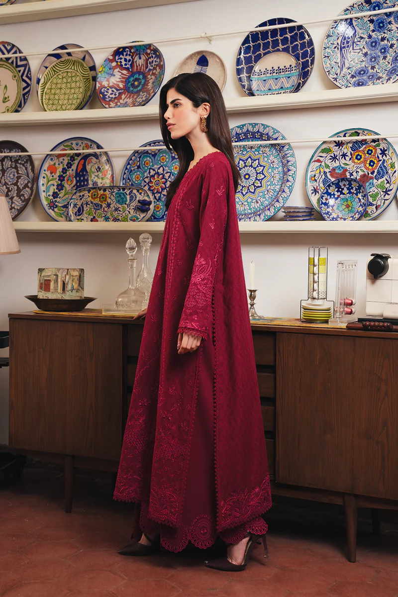 Paired with coordinating trousers and a gracefully draped dupatta edged in ornate lacework, the look feels bold yet beautifully composed. The deep red hue embodies celebration and confidence, making it a powerful choice for evening gatherings and festive occasions.