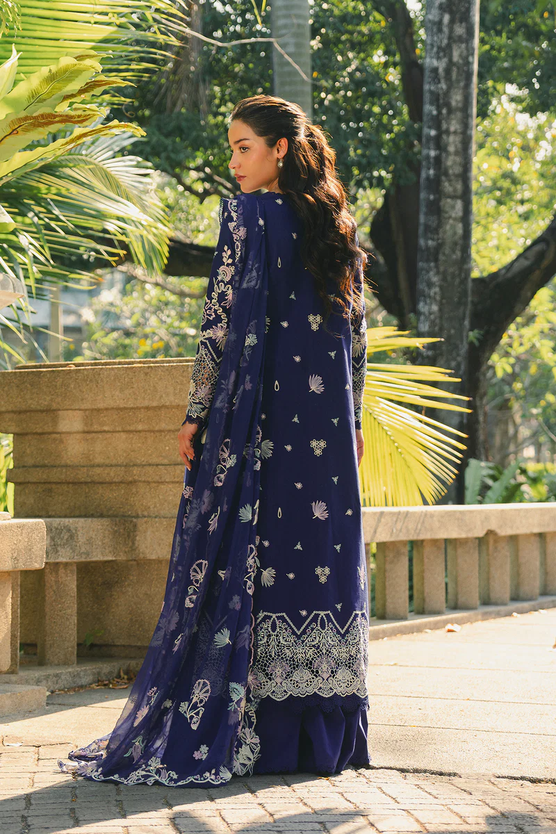 In a rich midnight blue fabric, this ensemble embodies elegance and depth. The shirt, flowing with full sleeves and a graceful silhouette, is adorned with intricate white floral embroidery and lace detailing that traces the neckline, sleeves, and hem like moonlight on water. The trousers, tailored in the same deep blue tone, provide balance and structure, their simplicity allowing the embroidery to shine. Draped lightly across the ensemble, the matching dupatta carries delicate threadwork and lace accents, completing the look with softness and refinement. The interplay of deep blue serenity and white purity feels like a poetic embrace, a union of elegance and devotion.