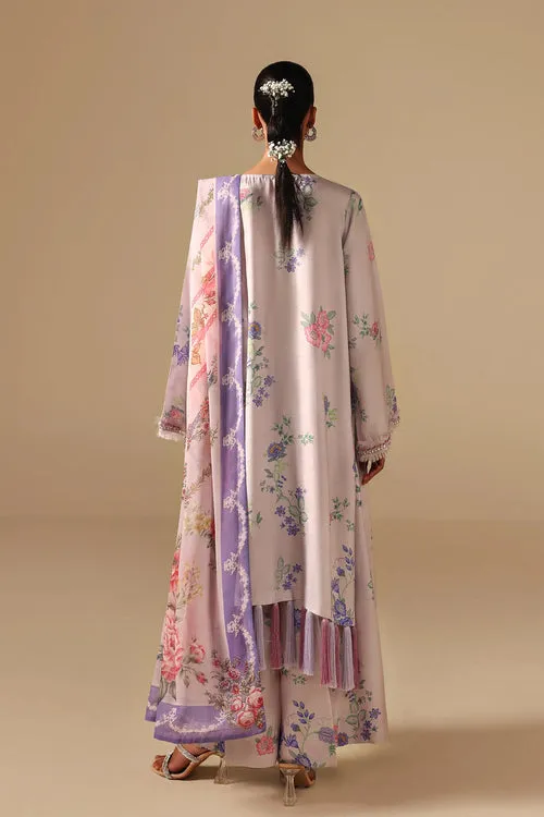 This lilac three-piece set features a long, straight-silhouette shirt with a printed base and hand-embellished floral motifs along the front and sleeves. The beading consists of pearls, sequins, beads, and thread-work. The hemline is accented with tonal handcrafted tassels. The ensemble is paired with matching printed wide-leg pants and a sheer AK print dupatta with contrasting borders. This ensemble balances festive detail with graceful elegance, making it an ideal choice for Eid celebrations.