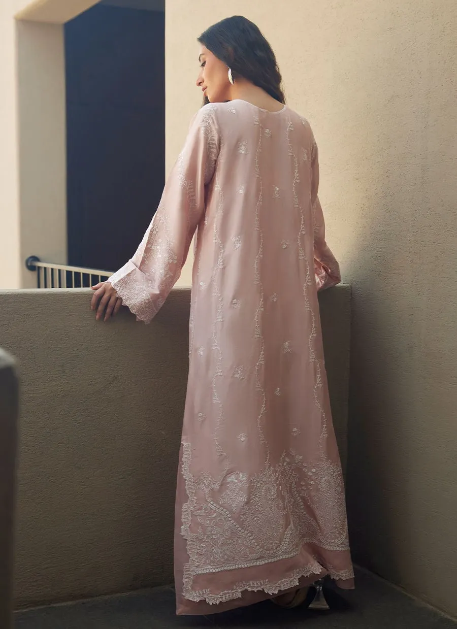 Graceful and delicately detailed, this nude pink kaftan is adorned with exquisite ivory embroidery that lends a soft, refined elegance. Hand-embellished stones add a subtle touch of shimmer, while the scalloped border along the hem enhances the silhouette with a romantic, polished finish. Effortless yet elevated, this kaftan is perfect for moments that call for understated glamour.