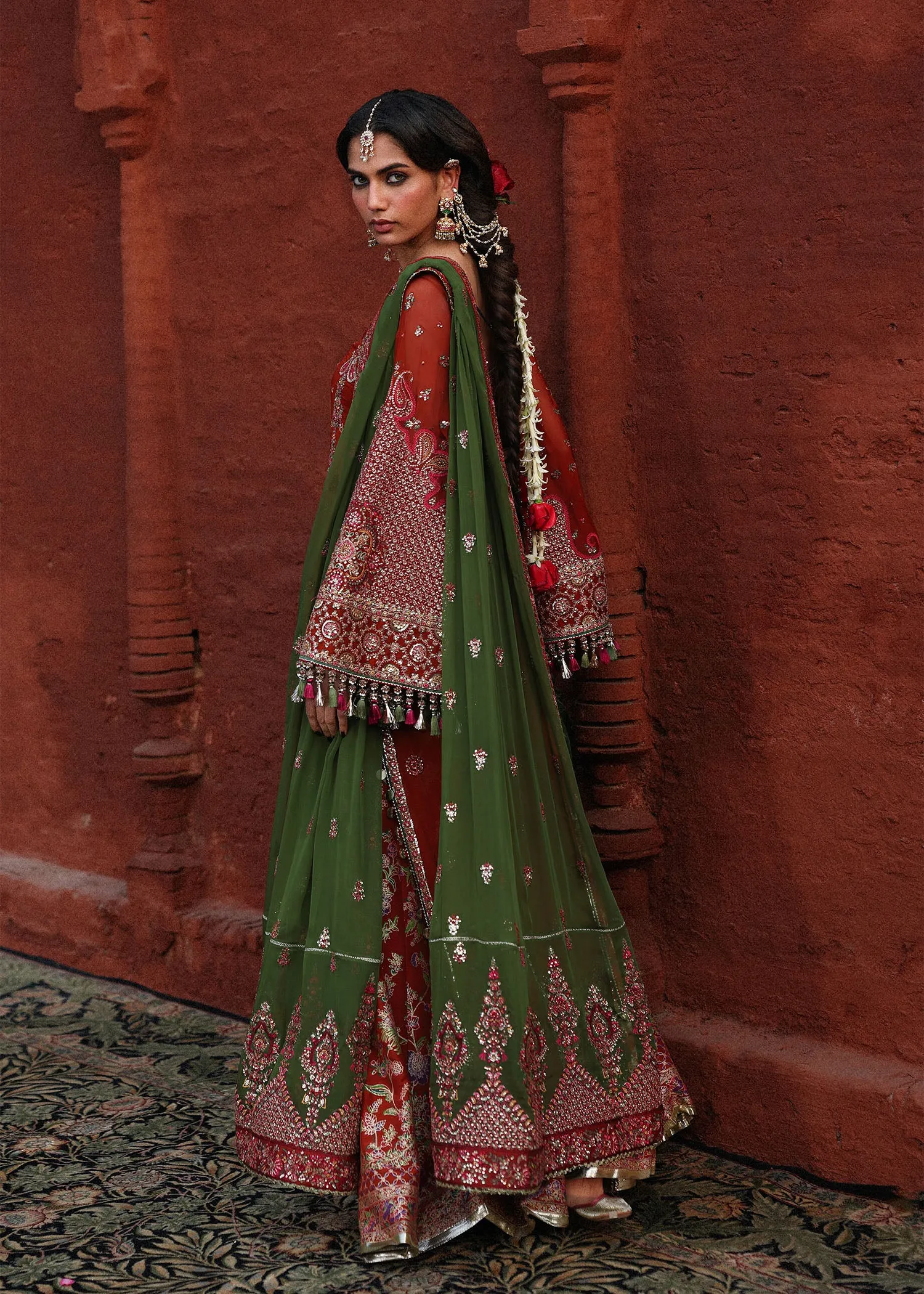 This refined ensemble is a sophisticated expression of contemporary elegance and traditional craftsmanship. The embroidered chiffon shirt is intricately detailed with delicate embroidery and enhanced with a beautifully finished border that adds structure and visual depth. The embroidered sleeves, complemented by finely crafted sleeve borders, elevate the design with a polished and graceful finish. Paired with a screen printed Korean raw silk sharara, the outfit offers a harmonious blend of texture and modern appeal. Completing the look is an embroidered chiffon dupatta, exquisitely adorned with embroidery and finished with four-sided embroidered borders, lending a luxurious and graceful drape. Perfect for festive occasions and formal gatherings, this ensemble reflects timeless style and artisanal excellence.
