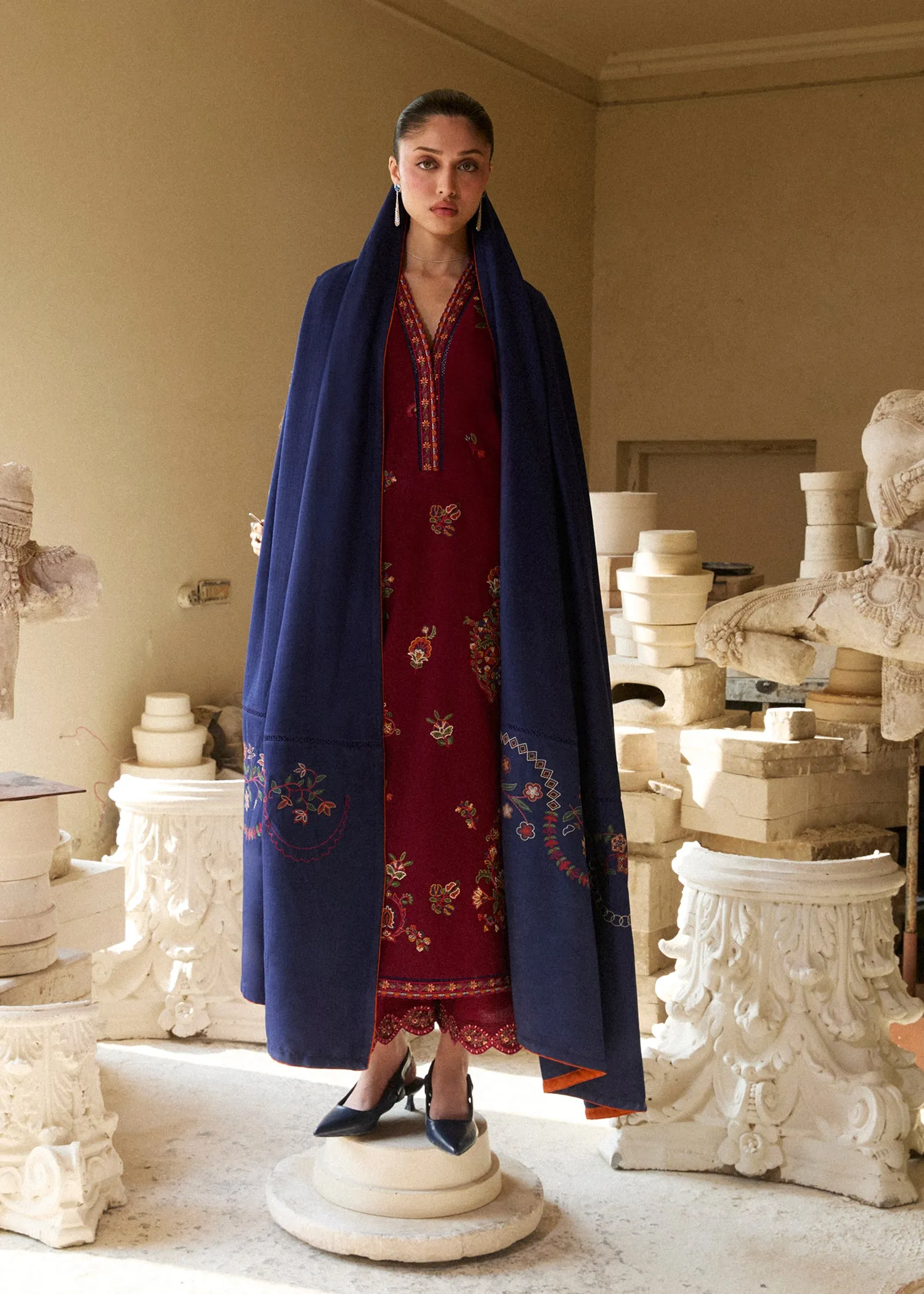 Turn up the charm in this deep maroon three-piece khaddar outfit, featuring multihued embroidery, overlapped embroidered neck and Patti on hem edges on a shirt with statement bell sleeves and embroidered Patti on sleeves. The embroidered culottes adds an elegant twist. It is paired with navy blue embroidered khaddar shawl. perfect for effortless day-to-evening style in winters.