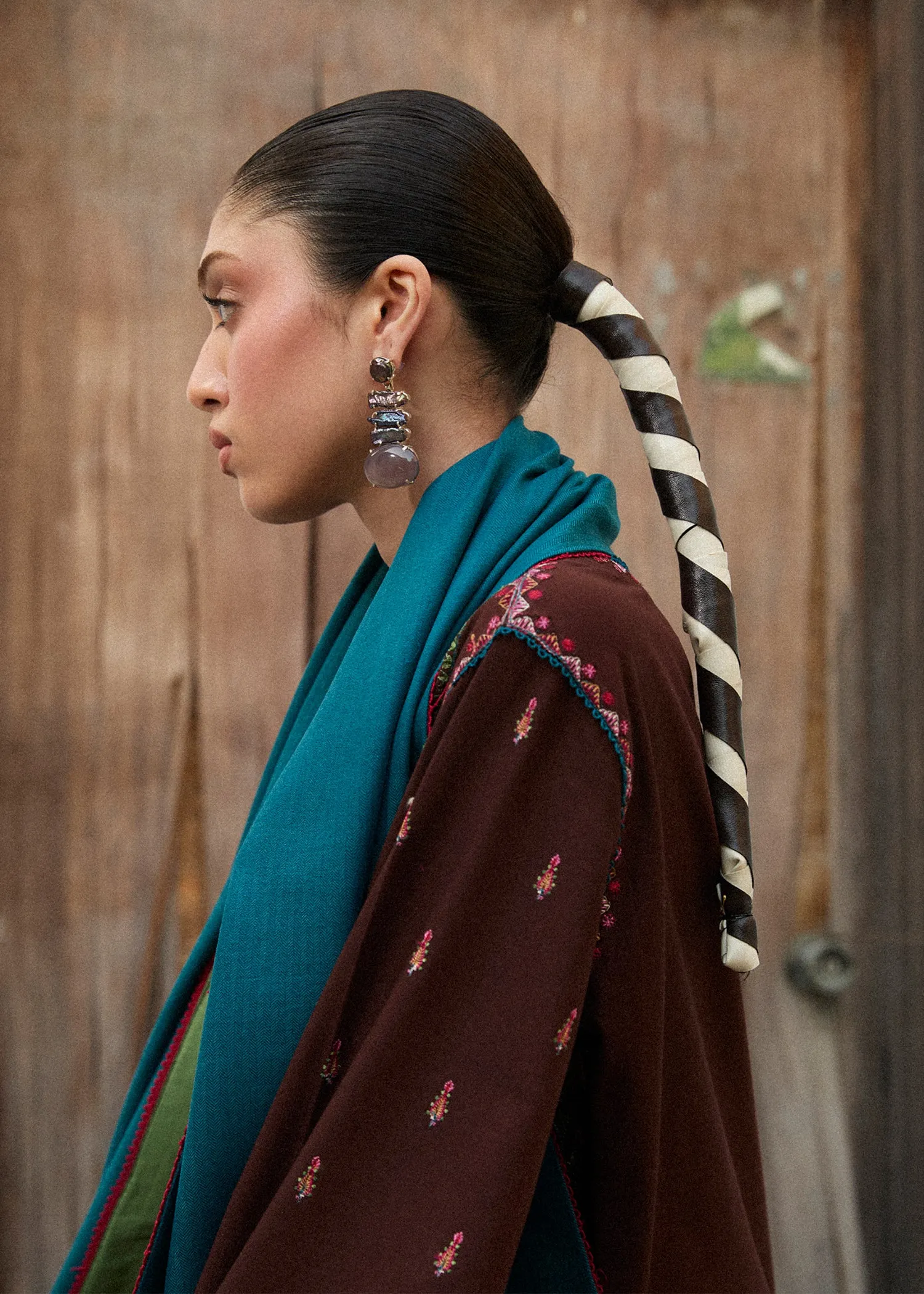 This elegant three-piece women’s outfit features a chocolate brown khaddar shirt with intricate embroidery details on the front and an asymmetric neckline. The sleeves are adorned with a contrasting turquoise embroidered Patti. It comes with embroidered culottes, finished with delicate lace details, and is paired with a matching embroidered shawl in a contrasting turquoise.
