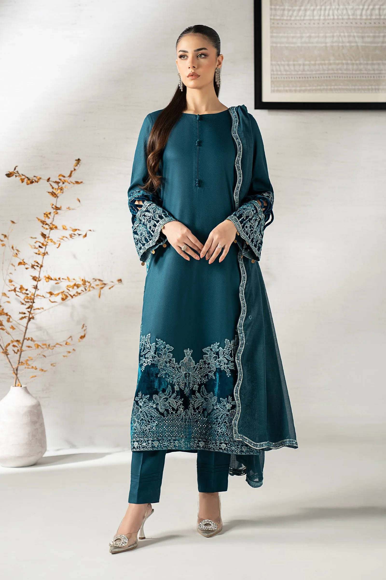 Dyed Sleeves With Velvet Loops Detailing & Embroidered Border