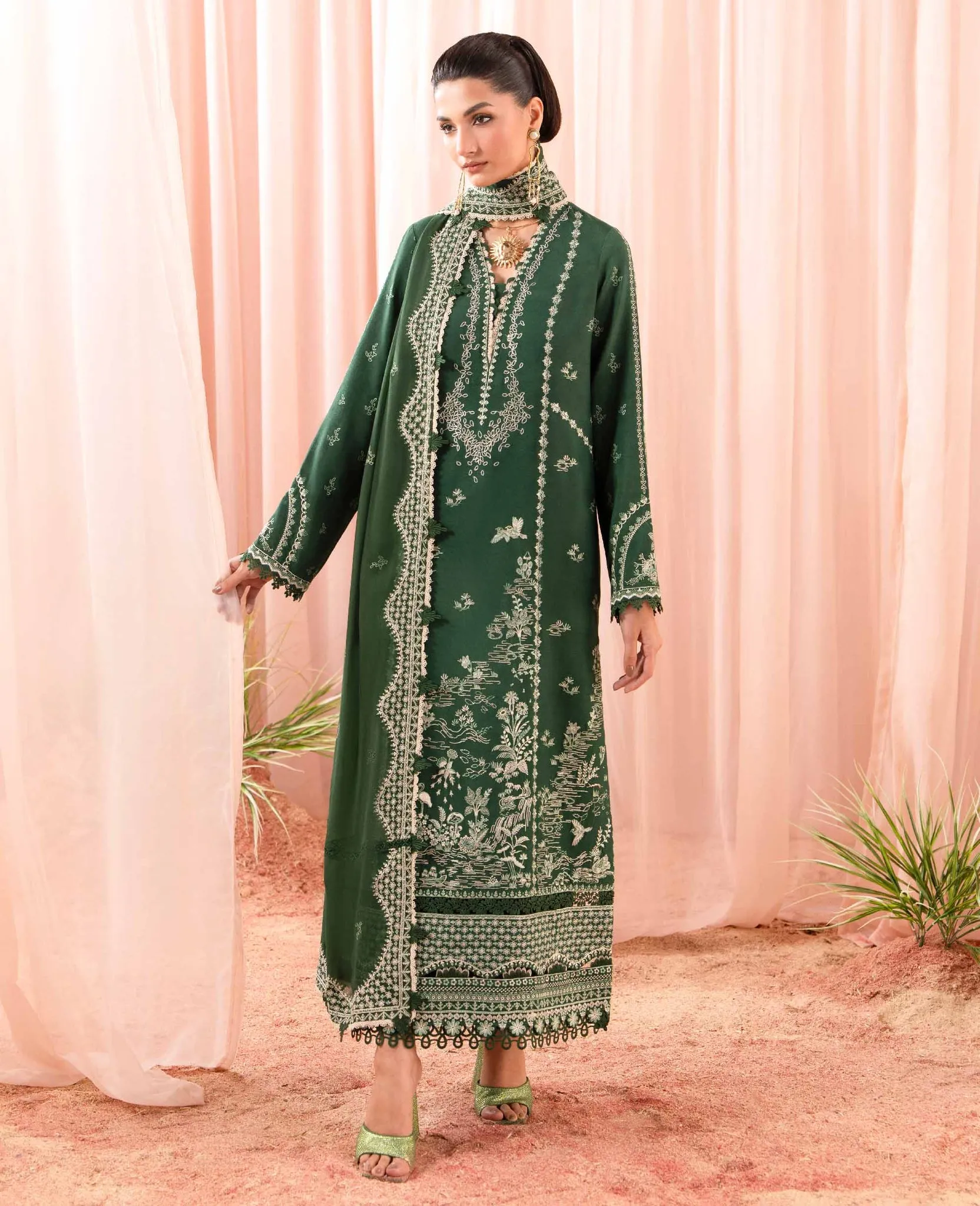 This 4-paneled long shirt in a deep olive green hue is elevated with refined shikargah-inspired embroidery in subtle monotones, creating a look that feels both rich and restrained. Designed on a fluid silhouette that moves effortlessly, it’s paired with a sheer chiffon dupatta for soft contrast and finished with raw silk trousers that add structure and polish. A thoughtful balance of heritage motifs and modern elegance, this ensemble is timeless, detailed, and perfect for understated festive dressing.