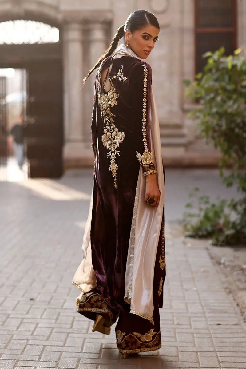 A timeless straight long shirt crafted in luxurious pure velvet, adorned with silver and gold zari embroidery and heavy zardozi work. The intricate embellishments—kora, dabka, cutdana, stones, pearls, nakshi, and sequins—grace the front, back, and sleeves, reflecting refined craftsmanship. Paired with cotton charmeuse culottes featuring silver and gold zari, lorix embroidery, and Banarasi appliqué, adding depth and detail. The ensemble is completed with a fog beige lame chiffon dupatta, delicately embroidered in gold, silver, and lorix, creating a perfect balance of elegance and sophistication.
