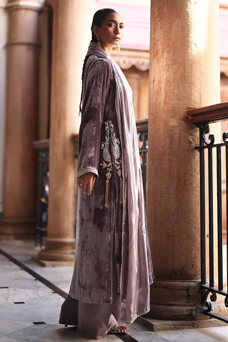 A loose-cut pure velvet shirt in an elegant Quail hue, featuring pockets and adorned with intricate silver and gold zari embroidery. The ensemble showcases exquisite antique zardozi work, enhanced with kaamdani, dabka, nakshi, stones, cutdana, moti, and crystals across the front, back, and sleeves. It is paired with cotton charmeuse culottes and a lame chiffon dupatta beautifully embroidered in gold, silver, and lorix — a perfect fusion of traditional artistry and modern refinement.
