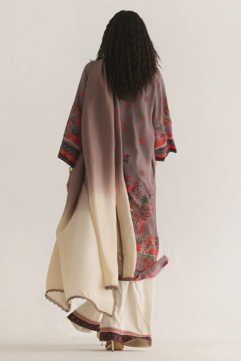 Featuring a Pure Crepe shirt, Cotton Charmeuse culottes, and a Pure Medium Silk dupatta, this ensemble blends comfort with elegance.The digital print is highlighted with texture sequins, stones, cutdana, pearls, and kora embellishment.Rendered in the cool shade of Cinder Grey and Ivory, offering a refined and contemporary look.