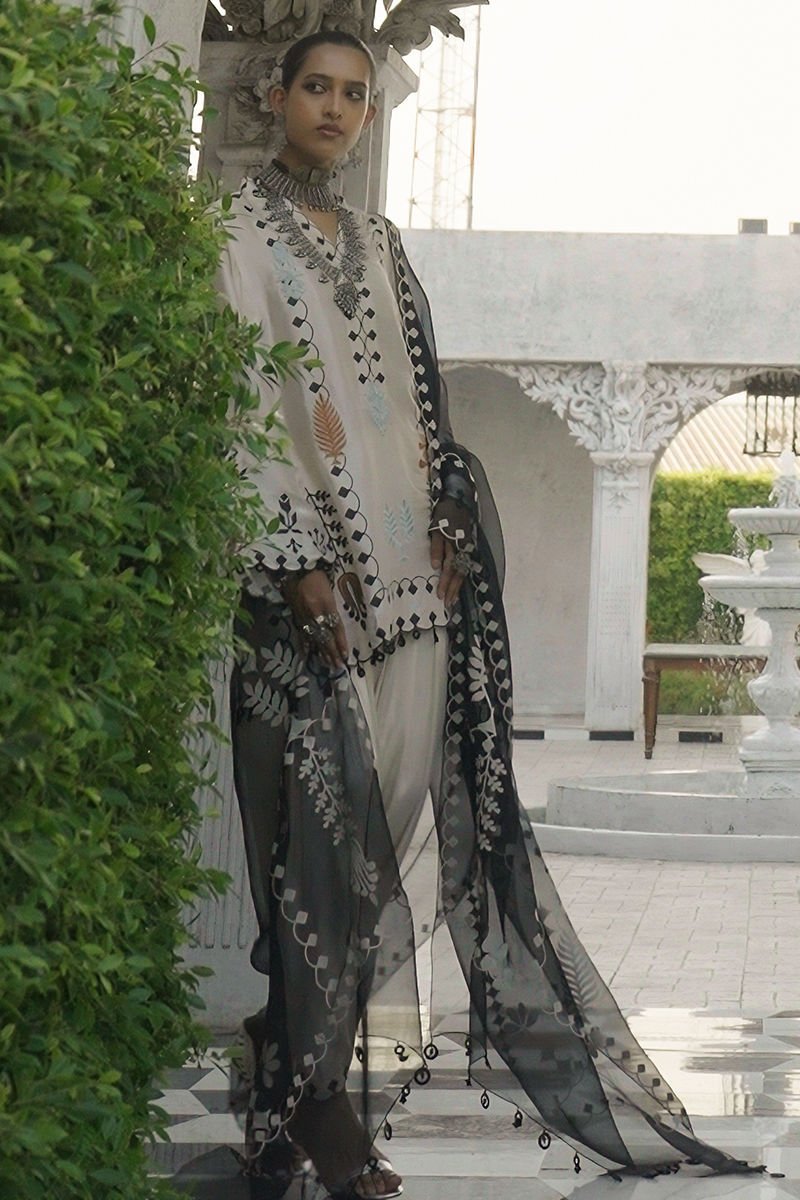 The cloud cream butter silk loose-cut short shirt, adorned with pockets, intricate screen print, coloured resham embroidery, and delicate hangings on front, back & sleeves, exudes artisanal elegance. Matched with cream gold khari shalwar in cotton charmeuse with screen-printed detailing at the bottom, and paired with a black shisha organza dupatta featuring screen print and handmade tassels for a contemporary, elevated look.