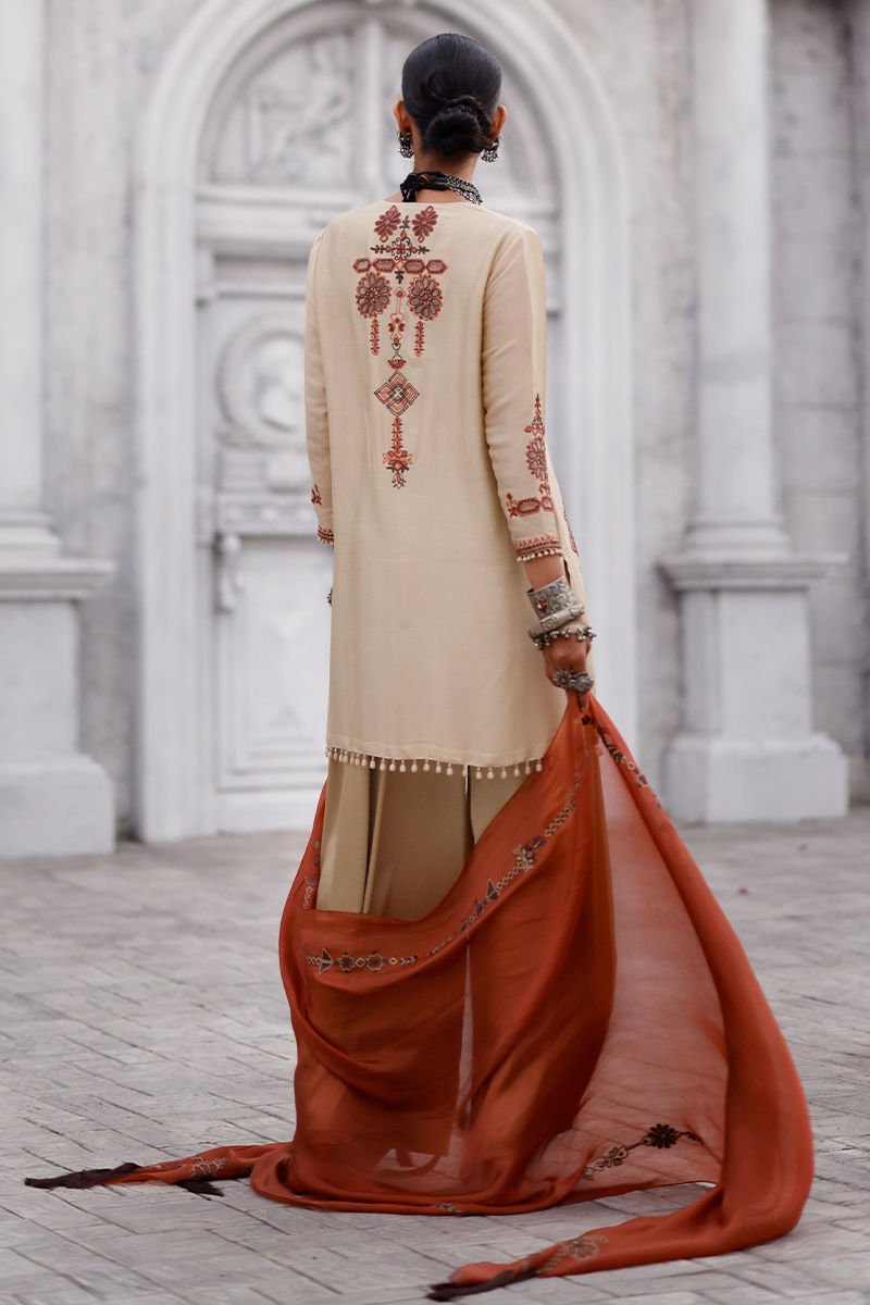 The almond puff front-open short shirt, crafted from butter silk, features intricate aari embroidery and delicate handmade hangings across the front, back, and sleeves. It is paired with balloon pants in cotton charmeuse for a fluid and comfortable silhouette. The ensemble is completed with a burnt rust shisha organza dupatta, adorned with coordinating aari embroidery and finished with handmade tassels, adding a graceful and artisanal touch.