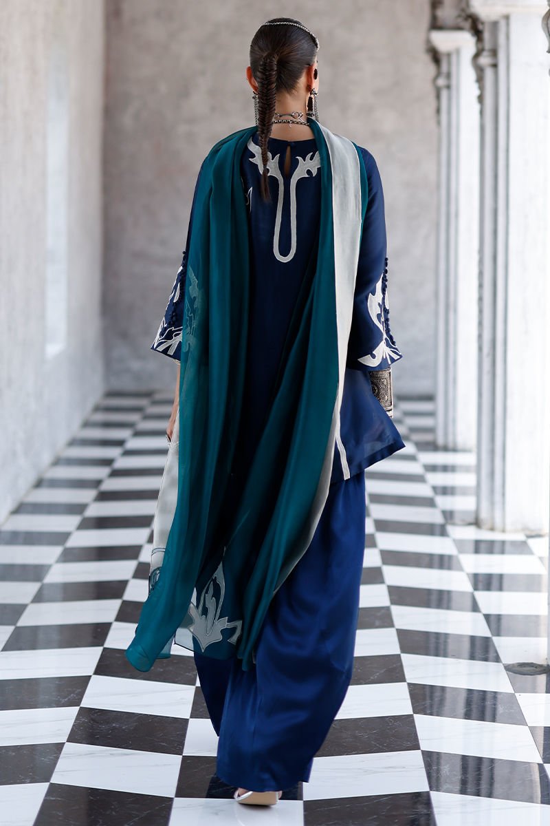 The deep blue short shirt, crafted from butter silk, features intricate self 3D detailing with appliqué work and resham embroidery across the front, back, and sleeves, creating a richly textured and refined look. It is paired with fluid cotton charmeuse balloon pants for effortless elegance, and completed with a sea green shisha organza dupatta adorned with appliqué work and resham embroidery, adding a graceful and elevated finish.