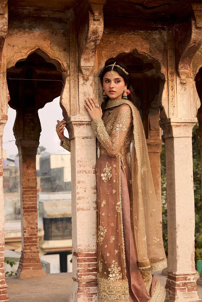 This look features a soft fawn-colored long shirt crafted with a delicately structured bodice, blending grace with subtle sophistication. The shirt is adorned with intricate embroidery and hand embellishment, adding a gentle shimmer that catches the light with every movement. Paired with it is a luxurious raw silk sharara, its rich texture offering a timeless regal charm.