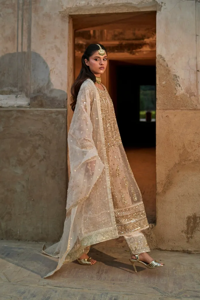 This beige organza shirt is meticulously hand-crafted and fully embroidered with delicate pastel motifs. Paired with a luxurious raw silk shalwar and a matching intricately detailed organza dupatta, the ensemble exudes timeless elegance—perfect for grand festive occasions and formal celebrations.