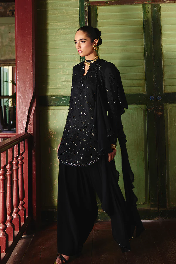 - Silk short shirt with scalloped neckline, gold crescents, and 3D floral detailing