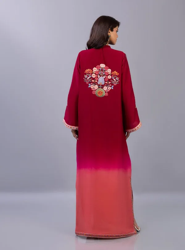 Command attention this festive season in this breathtaking ombré ensemble, a vibrant celebration of color and traditional craftsmanship. The kaftan features a stunning ombre transition from a deep, regal crimson at the top to a bright, sun-kissed coral at the hem, creating a mesmerizing visual flow. The front is exquisitely detailed with delicate Suzani-style floral bouquets and bird motifs, while the back showcases a grand, circular floral medallion that serves as a true focal point of artisanal luxury.