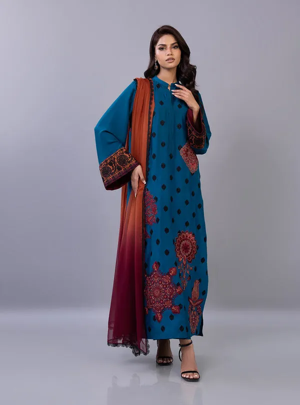 Capture the essence of artisanal beauty in this striking teal ensemble, where traditional Suzani craft meets a vibrant, modern palette. The long shirt is intricately detailed with all-over black motifs and bold, rust-toned medallions that anchor the hem and the wide, statement cuffs. A sophisticated band collar adds a refined structure to the silhouette, while the dual-toned rust dupatta provides a warm, glowing contrast to the cool peacock blue base. This masterpiece of color and craft is the ultimate choice for a standout Eid look.