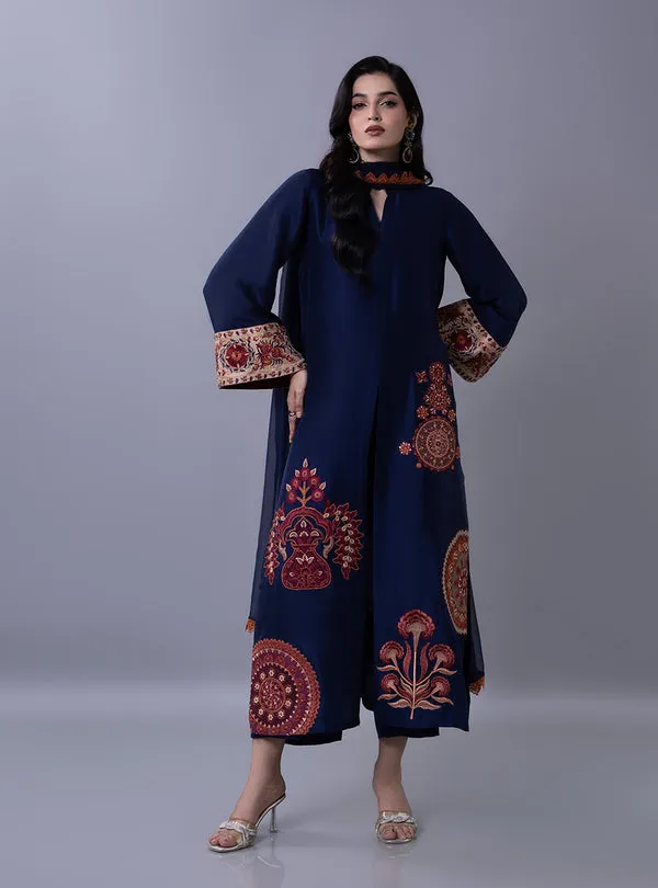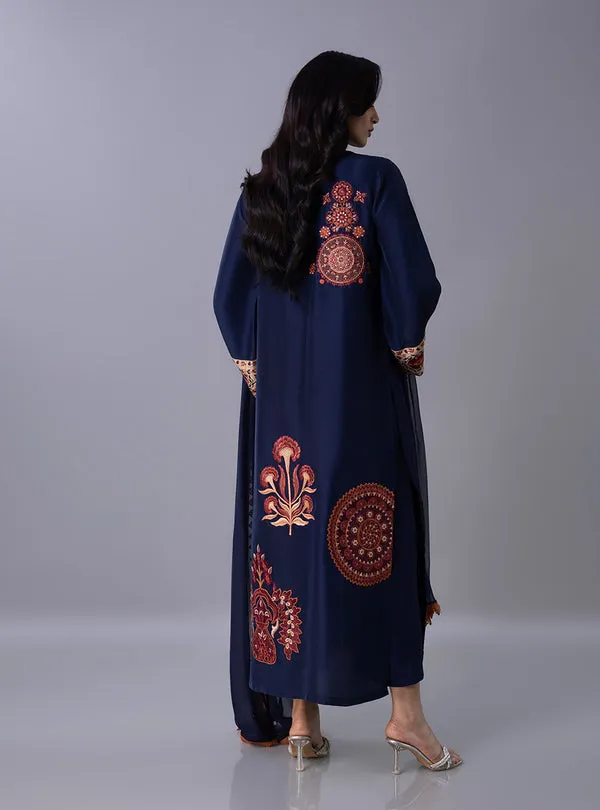 This long shirt is adorned with exquisite Suzani-style threadwork, featuring large, ornate circular medallions and stylized floral motifs in a rich warm palette of rust, burnt orange, and muted gold. This intricate embroidery extends to the wide, statement cuffs of the sleeves and is perfectly complemented by a matching pants and a dupatta finished with a lace. This opulent outfit offers a majestic silhouette, making it an impeccable choice for evening festive gatherings and refined Eid dinners.
