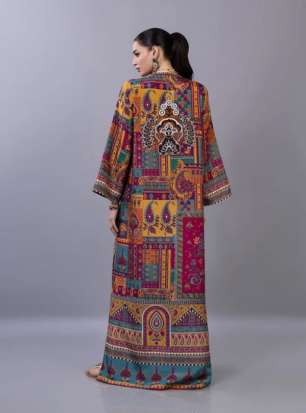 Step into a world of vibrant heritage with this stunning kaftan, a rich tapestry of traditional patterns, blending deep teal, mustard, and crimson into a striking visual narrative. This piece is elevated by striking ivory-white embroidered appliqués on the front and back, providing a sophisticated contrast to the rich teal, mustard, and crimson palette. Crafted for the bold and the elegant, its relaxed silhouette and wide structured sleeves make it a standout choice for high-fashion festive wear.