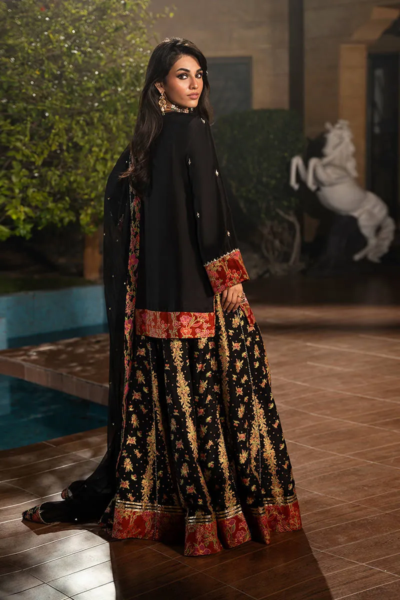 The pure raw silk shirt is beautifully enhanced with delicate hand embellishments and intricate embroidery, adding a refined shimmer and elevating its festive appeal. Paired with the shirt are screen printed sharara pants made from premium Korean raw silk. Completing the ensemble is a lightweight chiffon dupatta, adorned with subtle spray detailing for a soft, sparkling effect. The dupatta is finished with a finely screen printed border, perfectly complementing the embroidery and printed sharara.