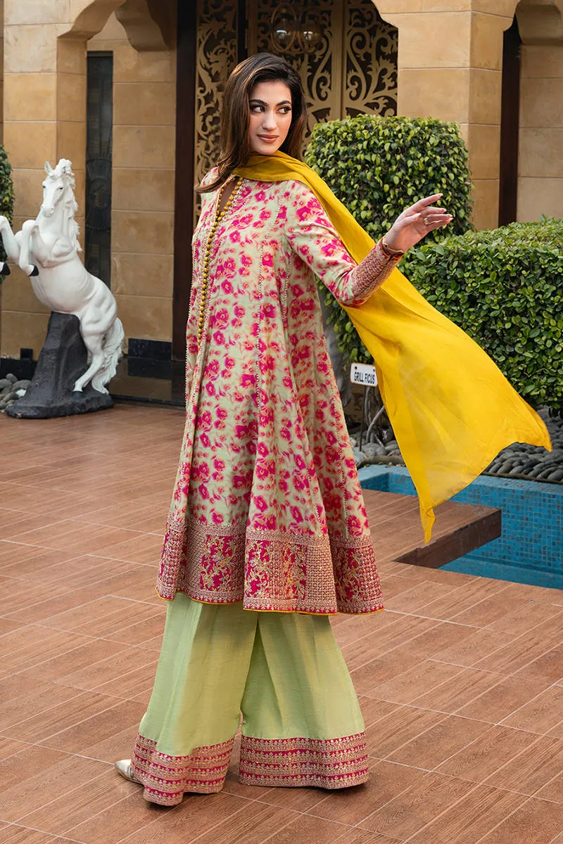 The Kalidar is crafted from luxurious digitally printed Korean raw silk, giving it a rich texture and a soft, structured fall. The hot pink floral print stands out vibrantly against the green base, creating a refreshing and festive look. Delicate button detailing on the front adds a classic touch, while the intricately embroidered borders enhance the overall sophistication of the Kalidar, highlighting fine craftsmanship. The outfit is paired with a flowing KP silk scarf.