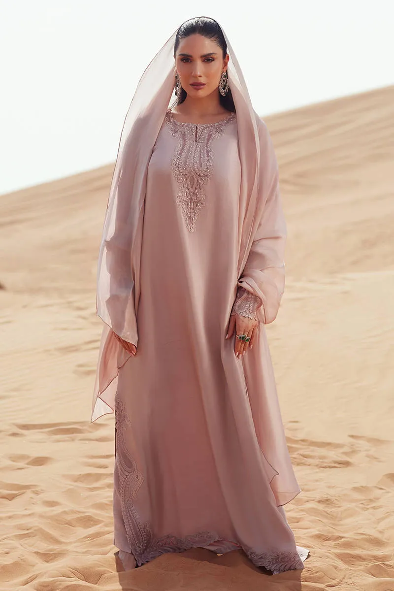 A pure raw silk shirt designed in a fluid kaftan silhouette, elevated with intricate embroidery and pearl embellishments along the neckline. Detailed cuff sleeves feature refined embroidery, adding structure and elegance. Paired with a tailored Korean silk cigarette trouser and finished with a KP silk scarf for a clean, contemporary look.