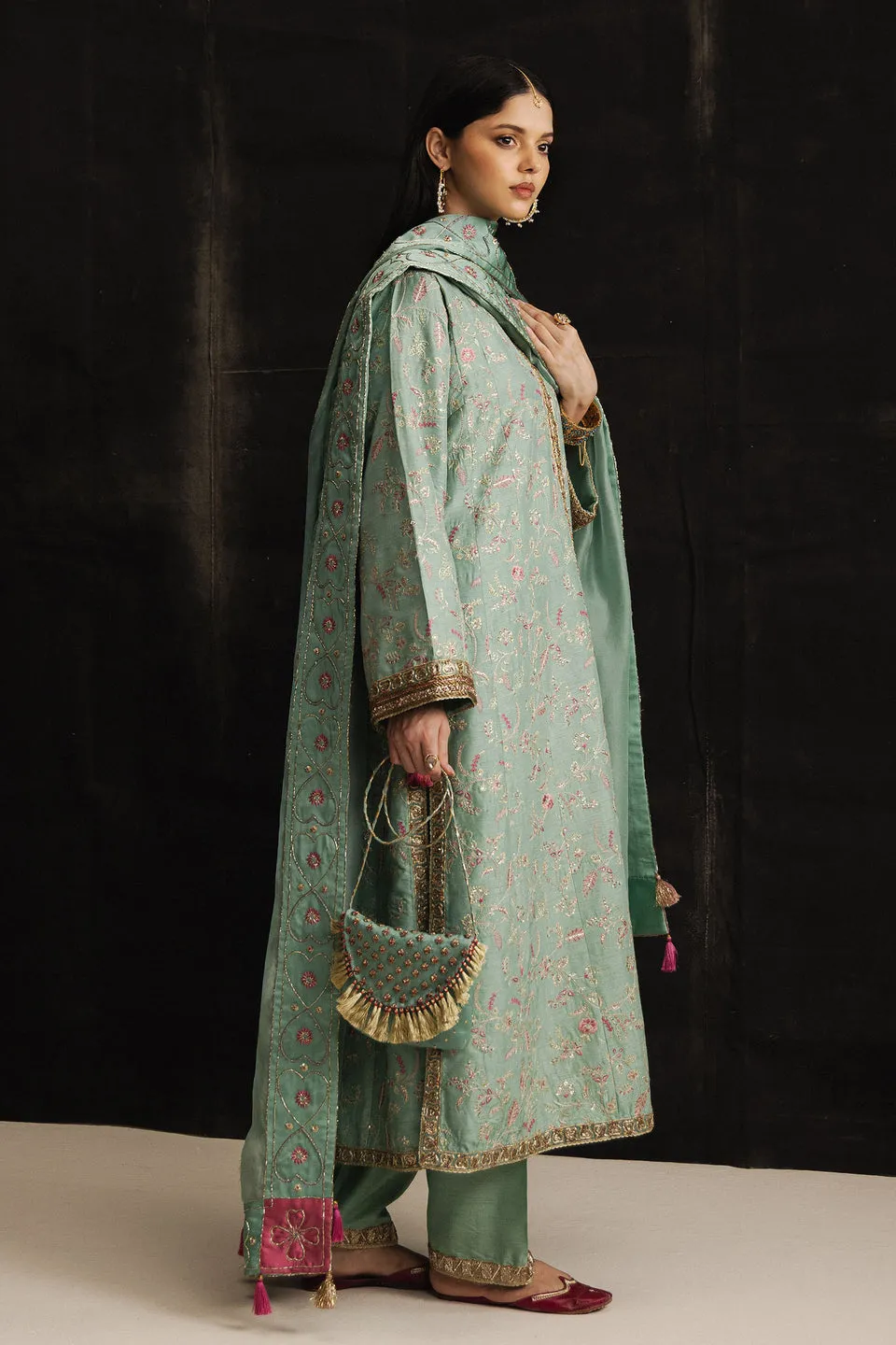 It is paired with a korean silk shalwar, delicately finished with adda details. The look is completed with a sheer pure organza dupatta, adorned with hand-appliqué embellished borders and elegant tassel detailing.