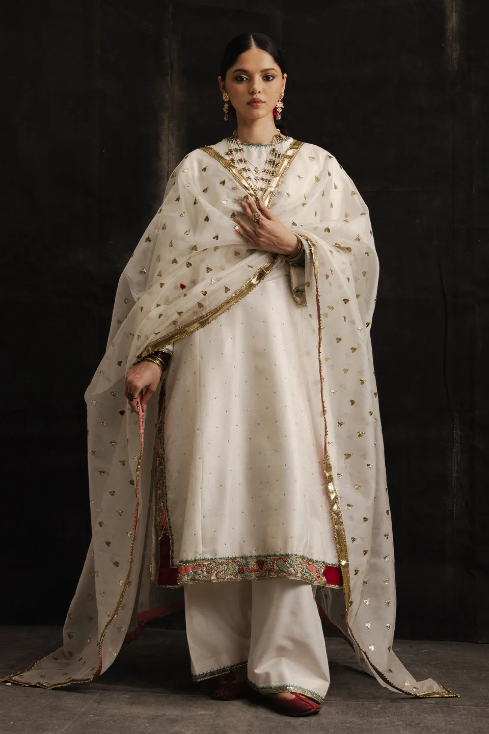 It is paired with a pure raw silk shalwar, adorned with subtle adda details, maintaining a balanced and elegant silhouette. The look is completed with a sheer pure organza dupatta, finished with delicate gotta appliqué that imparts just the right hint of festive charm.
